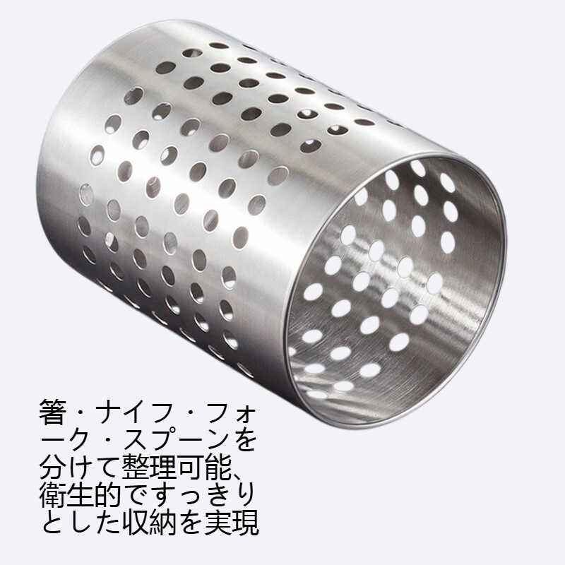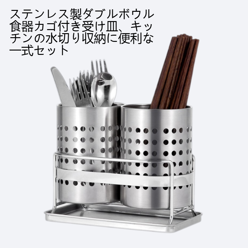 錆びにくいステンレス素材使用。二重構造で水切れ抜群。食器やカトラリーの収納に最適。キッチンを清潔に保つ。